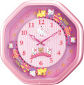 毎正時になると、メロディーが1曲(全12曲入り)流れて時を知らせるキャラクター時計です。メロディと共にキティーの汽車が回り、文字盤のうさぎと熊は常時揺れていますので、動きがあって楽しいクロックです。