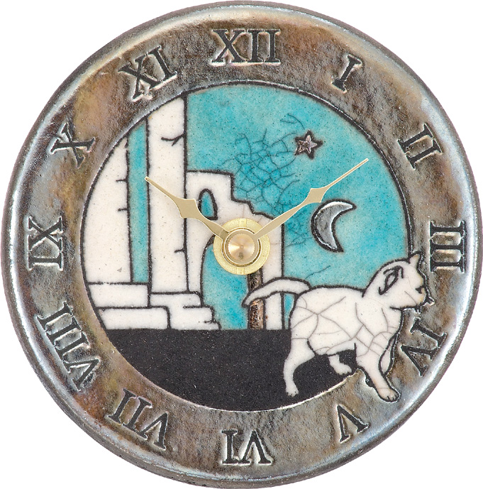 イタリア人陶芸家アントニオ・ザッカレラ製作の魅力的な陶器製アート置き掛け兼用時計です。作品はすべて手作りで、手書きによる絵柄と焼き加減により表現される色合いが、優しさと温かさを感じさせる存在感のあるクロックになっています。