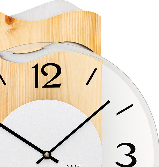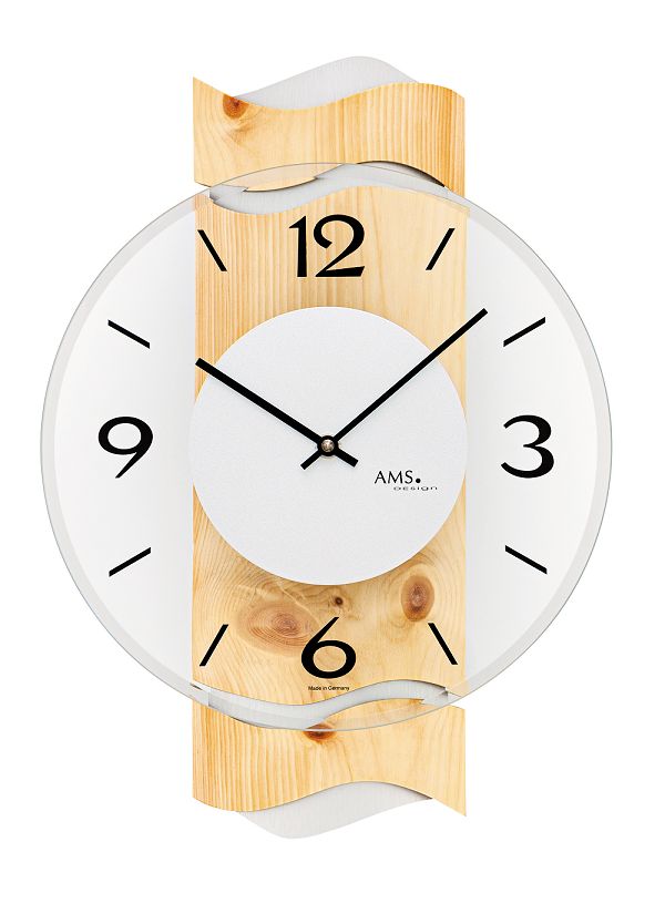 木の温もりを感じるお洒落なデザインの壁掛け時計です。(ドイツAMS社製) 天然木、ガラスとメタルの見事なコンビネーションのクロックは、シンプルで見やすい文字盤も魅力的です。