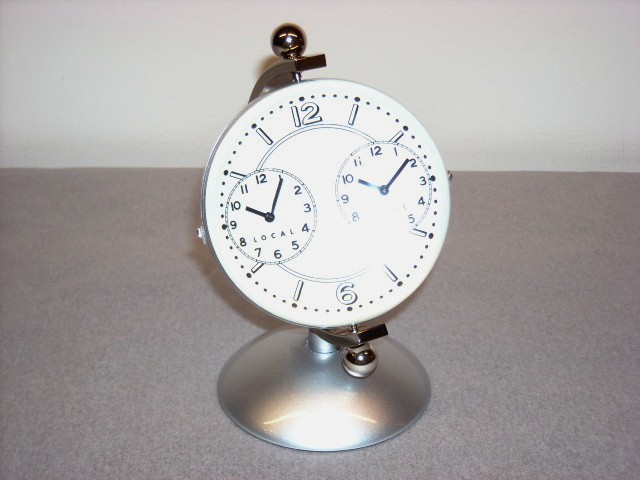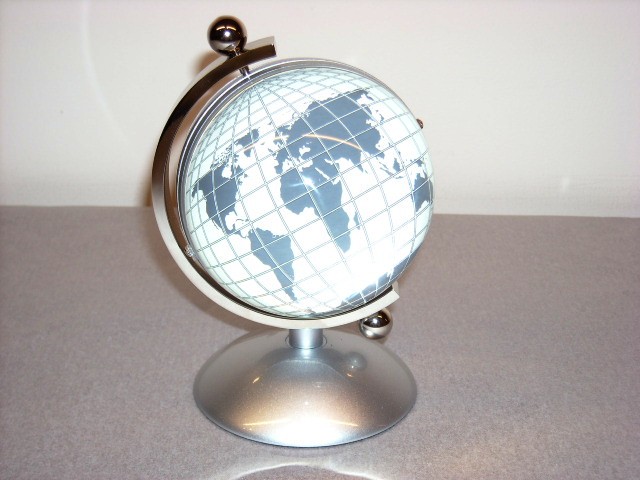 2カ国の時刻を同時に表示する地球儀型のデュアルデスククロックです。