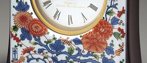 時計前面を飾る鮮やかな磁器の文様には「菊牡丹」を採用。