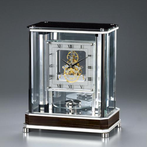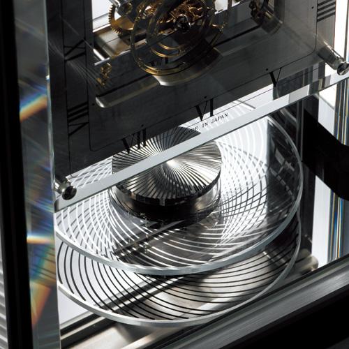 ガラス越しの空間に見えるクオーツ・スケルトンムーブメントの精緻な歯車や輪列と、渦巻く銀河を思わせる永遠の時間の流れを表現した回転飾り。
