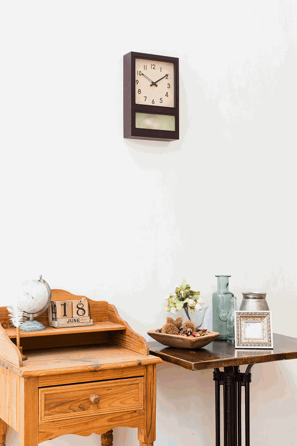 シンプルで見やすい文字盤には木材(シナ材)を使用し、魅力的なデザインとなっています。
