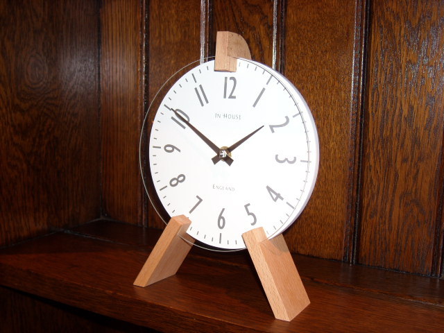 文字盤とガラスカバーが木製ペグで固定されたお洒落なデスククロックです。(INHOUSE ENGLAND製)