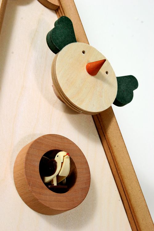天然木製の温かさを感じる本体ケースと、2羽の小鳥がアクセントになってとても楽しいクロックです。